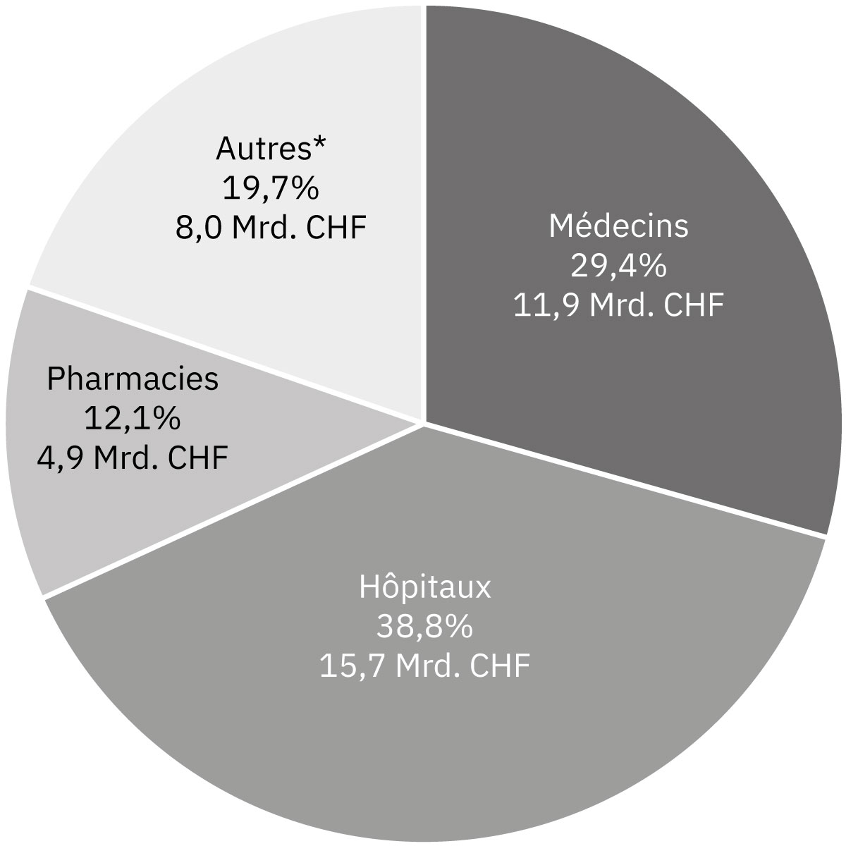 * Autres fournisseurs de prestations (selon l'art. 24 LAMal): chiropracticiens; sages-femmes; personnes prodiguant des soins sur prescription ou sur mandat médical ainsi que les organisations qui les emploient; laboratoires; centres de remise de moyens et d'appareils diagnostiques ou thérapeutiques; maisons de naissance; établissements médico-sociaux; établissements de cure balnéaire; entreprises de transport et de sauvetage; institutions de soins ambulatoires dispensés par des médecins.